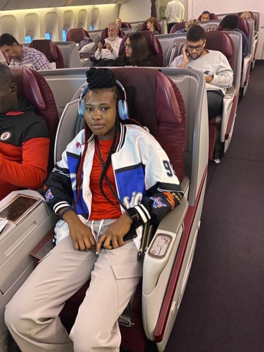 Little Haiti’s Nahomie Ambroise, in her airline seat at Miami International Airport, about to set off on her dream journey to Australia for the World Cup.
